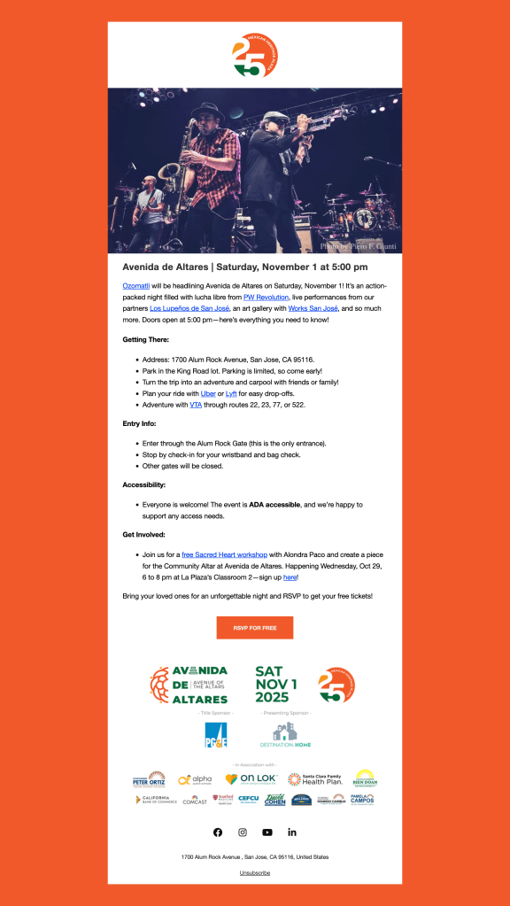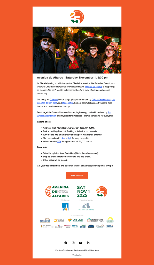 For Avenida de Altares, I created reels, graphics, and copy that highlighted the cultural experience, promoted the costume contest, and guided community members through key event details. My work focused on capturing the spirit of the celebration while encouraging engagement and participation across all activities.