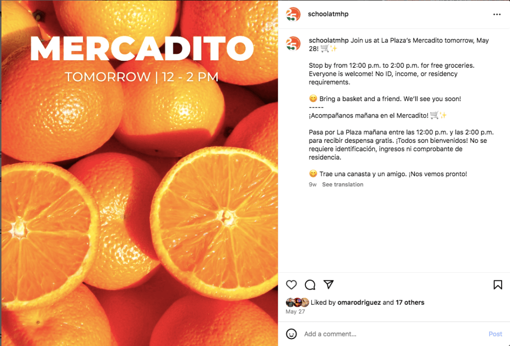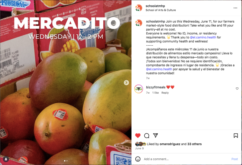 Mercadito is a walk-up food distribution inside La Plaza that provides families with free fresh groceries from 12 p.m. to 2 p.m. Originally created as an emergency response during COVID-19, it has grown into an ongoing support program powered by Second Harvest of Silicon Valley and community volunteers. For Mercadito, I created reels, graphics, and bilingual copy that shared key details, and helped families stay connected to this essential resource.